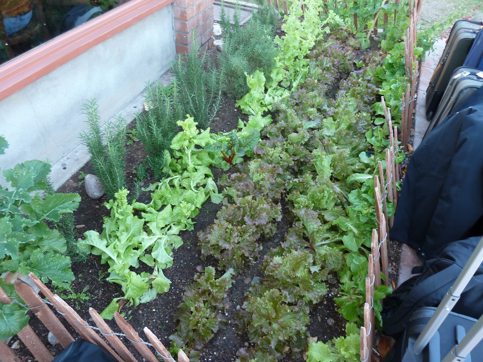 | They grow lettuces and rosemary in small garden patches on either side of the front door |